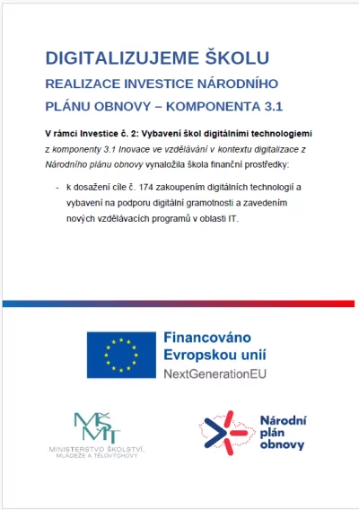 ← Zpět na aktuální informaceV roce 2022 nebo roce 2023 měly mateřské školy, základní školy, střední školy a konzervatoře možnost čerpat finanční prostředky k dosažení cíle č. 174 Zakoupení digitálních technologií a vybavení na podporu digitální gramotnosti a zavedení nových vzdělávacích programů v oblasti IT (digitální učební pomůcky) na základě Věstníku MŠMT
